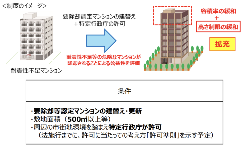 そこで改正法では、現行の容積率の特例に加え、耐震性不足などのマンションの建て替えや更新をする場合、行政庁の許可によって高さ制限も緩和できる特例が追加されます。ゆとりある設計で事業の採算性が上がれば、より建て替えしやすくなります。