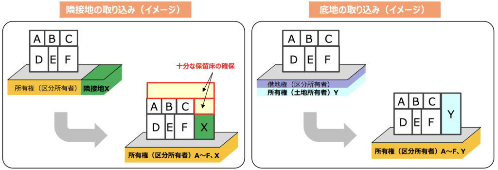 改正法では、隣接地の所有権を建て替えや再建後のマンションの区分所有権に権利変換できるようにします。また現在、底地の所有権は権利変換の対象になっていませんが、改正法では借地権・底地の権利変更も可能になります。これにより、借地権型マンションを所有権型マンションに移行できるようになります。