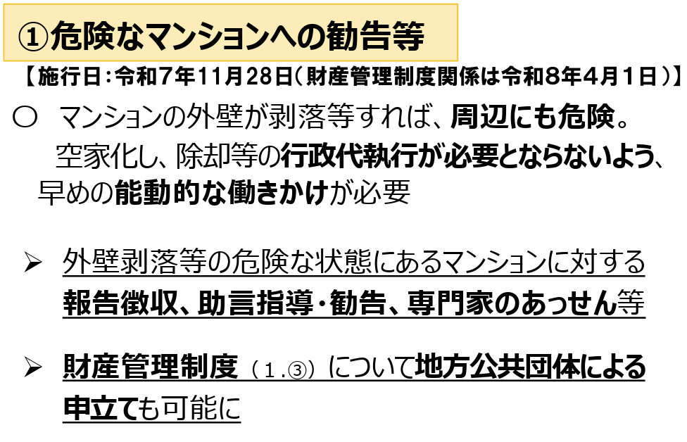 地方公共団体は、外壁の剥落などの危険な状態にあるマンションに対する報告徴収、助言指導・勧告、専門家のあっせん等に加え、改正法で創設される財産管理制度の申し立ても可能になります。なお、地方公共団体の権限強化については、すでに2025年11月に施行済みです。