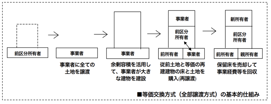 これまで建て替えが実施されてきたマンションの多くは、デベロッパーが参画して現行より大きなマンションを建築する「等価交換方式」を採用しています。ただ、現行より大きな建物に建て替えるには容積率がハードルとなります。