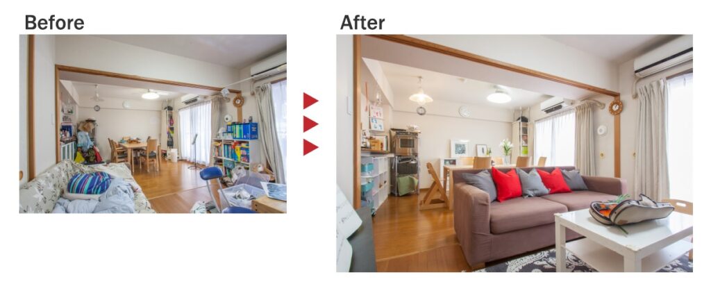 下記のBefore・Afterの写真は、手持ちのソファのカバーを外し、配置を変え、不要なものを他の部屋に移してクッションを追加しただけ。ローテーブルに置いたのは、娘さんのバイオリンです。これだけでもサイトに掲載したときの反響数は5倍程度に増えました。整理しただけですので、仲介手数料以外に売主さんにかかる追加費用などはありません。